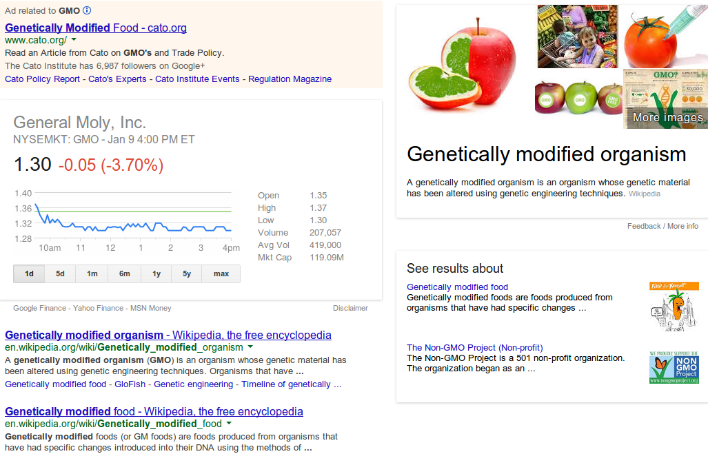 トップ結果は見事に遺伝子組換え生物関係だ。(wikipediaの蛍光色の魚が綺麗)